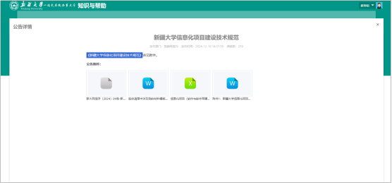如下图所示,可登录“一站式办事大厅”->“知识与帮助”->“网络服务手册”->“新疆大学信息化项目建设技术规范”,查看《新疆大学信息化项目建设技术规范》文件。