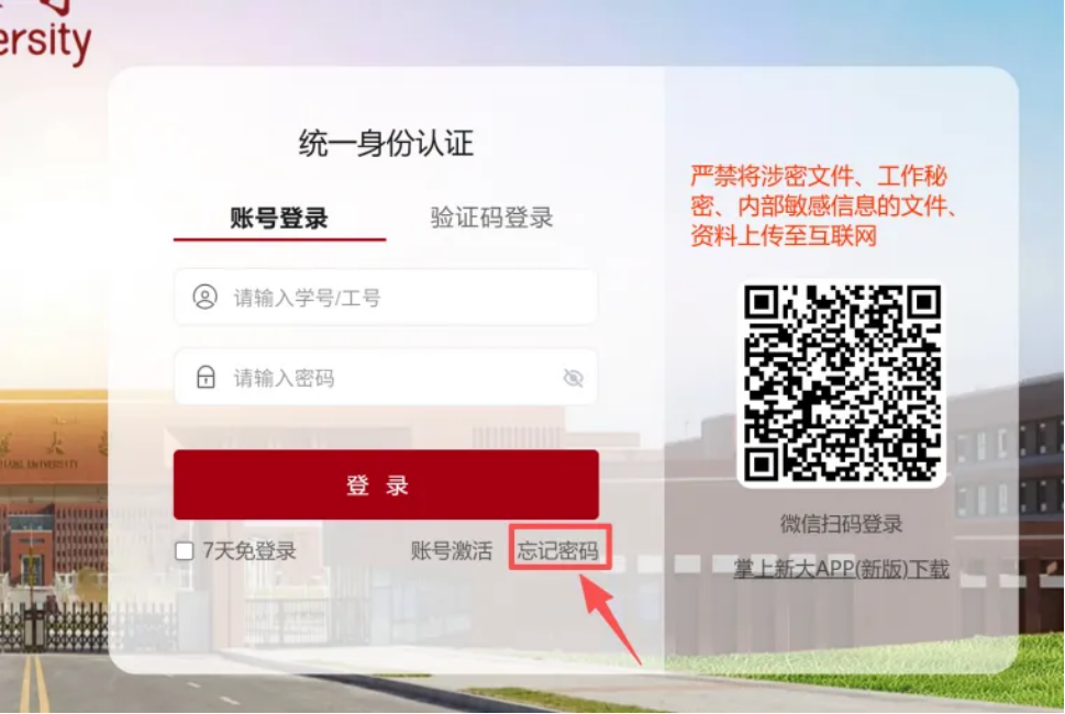访问统一身份认证页面(https://authserver.xju.edu.cn/),点击“忘记密码”。