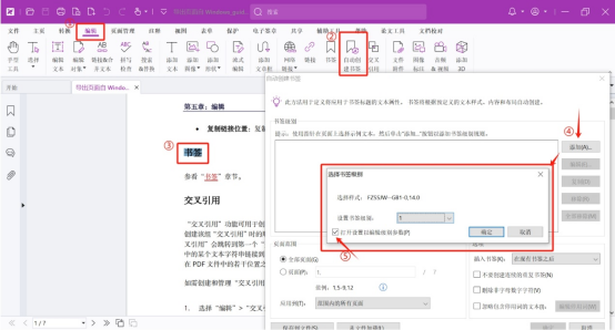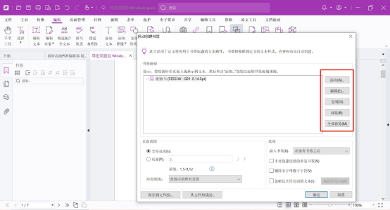 利用福昕高级PDF编辑器打开需要创建书签的文档,点击“编辑”>“自动创建书签”,程序将弹出“自动创建书签”对话框。然后选择你要作为书签的文本样式,点击“添加”,系统将弹出“选择书签级别”对话框,我们设置好书签级别,勾选“打开设置以编辑级别参数”,然后点击确定。