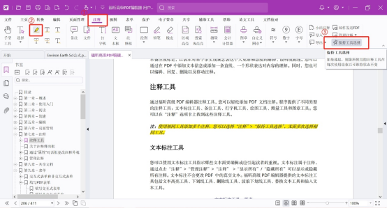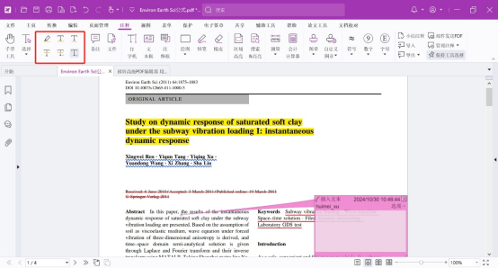 我们利用福昕高级PDF编辑器打开一份文档,可以在注释菜单栏看到一排注释工具,里面有我们常用的:高亮、波浪线、下划线、删除线、替换文本、插入文本功能。