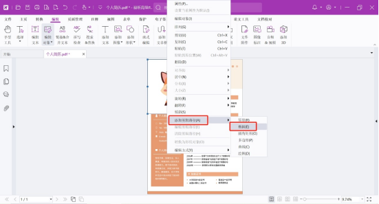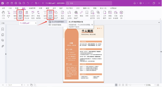 我们利用福昕高级PDF编辑器打开一份文档,比如这份简历,我们想做一个圆形的头像,我们可以点击“编辑”>“添加图像”>“从文件创建图像”,然后选择一张头像导入文档中。