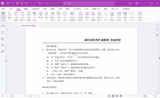 我们利用福昕高级PDF编辑器打开一份文档,菜单栏包含“转换”“编辑”“页面管理”“注释”等,点击会出现相应的小功能。