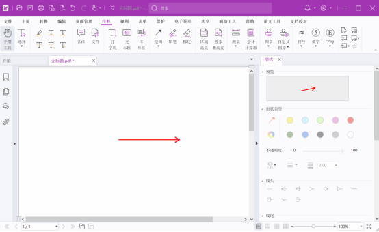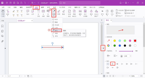 我们打开福昕高级PDF编辑器,点击“注释”>“绘图”,选择箭头图形,在文档中画一个单箭头后,利用手型工具选择箭头,点击右侧小三角形打开格式面板,在箭头中选择左箭头即可。设置一次后,下次再选择该图形绘制,都会变成双箭头哦!